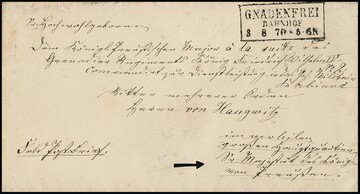 Feldpost, 1870, Ra3 "Gnadenfrei Bahnhof" auf dekor. adressiertem Couvert an einen Angehörigen "im mobilen Hauptquartier Sr. Majestät des Königs von Preußen"