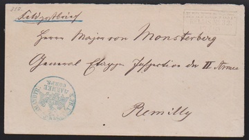 Feldpost, (1870), Ra3 "K. Pr. Feld-Post-Relais No. 32" auf Couvert mit blauem Truppenstempel des Etappen-Commandos des 4. Armee-Corps an den Major von Monsterberg bei der General-Inspektion der II. Armee in Remilliy