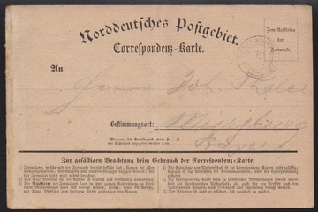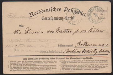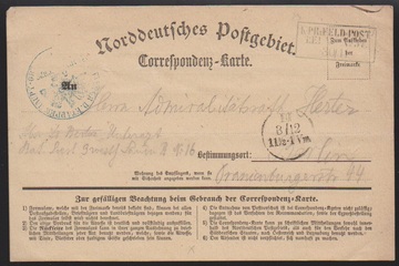 Feldpost, (1870), blauer K2 "K. Pr. Feldpost-Exp. II. Grd. Inf. Div." (Feuser nicht gelistet) auf Feldpost-Correspondenzkarte vom Mecklenburger Baron v. Maltzan an seine Frau in Moltzow bei Schwerin, Karte unten Faltspur