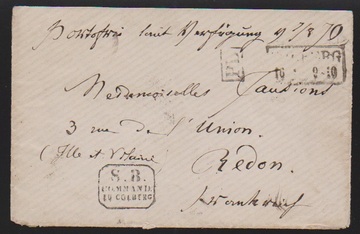 Kriegsgefangenenpost, 1871, kleines Couvert eines französ. Kriegsgefangenen mit Ra2 "Colberg" und kleinem Ra3 "S.B. Command. zu Colberg" nach Redon/Frankreich