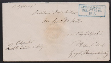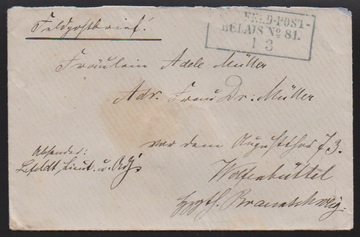 Feldpost, (1871), klarer blauer Ra3 "K. Pr. Feld-Post-Relais No. 81" auf Damencouvert nach Wolfenbüttel