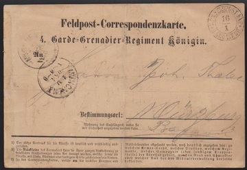 Feldpost, 1871, K2 "K. Pr. Feldpost-Exp. II. Grd. Inf. Div." auf seltener Feldpost-Correspondenzkarte mit Individual-Vordruck "4. Garde-Grenadier-Regiment Königin" nach Würzburg, stärkere Gebrauchsspuren und Falte