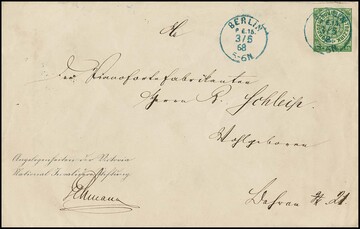 Privat-Ganzsache der Victoria-National-Invaliden-Stiftung, 1/3 Gr. grün, Format 187:119mm, Pracht-Ortscouvert mit blauem K1 "Berlin P.E. 15" (3.5.1868) und rs. mit entsprechender Vignette. Selten!