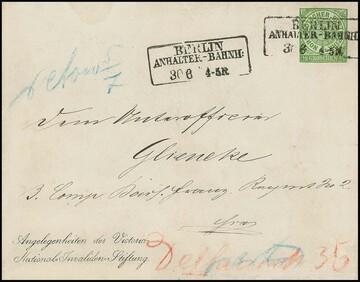 Privat-Ganzsache der Victoria-National-Invaliden-Stiftung, 1/3 Gr. grün, Format 150:119mm, gebraucht als Pracht-Orts-Retour-Couvert mit Ra3 "Berlin Anhalter-Bahnh:", rs. entsprechende Vignette
