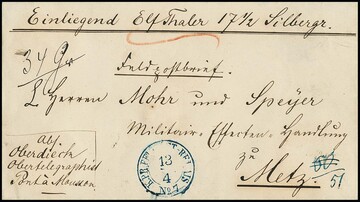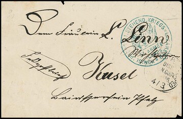 Feldpost, 1874, kleines Couvert (oben winzige Randkerbe) mit seltenem K1 "Feld-Post-Exped. 2. Disp. Gen. Gouv. in Lothringen" nebst blauem Truppenstempel "stehendes Kriegs-Lazarett 5. Armee" nach Kusel/Bayern, von einem Soldaten im Kriegs-Lazarett in Straßburg, Feuser 1000,-