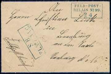 Feldpost, (1871), klarer blauer Ra3 "Feld-Post-Relais No. 99" auf blau gerandetem Damencouvert (min. Gebrauchsmgl.)