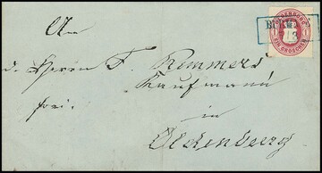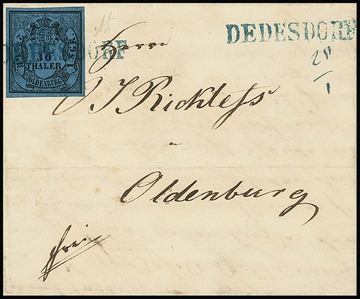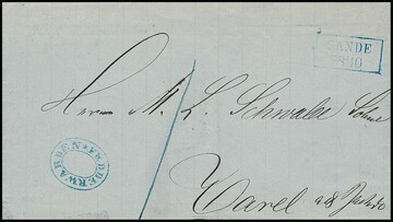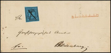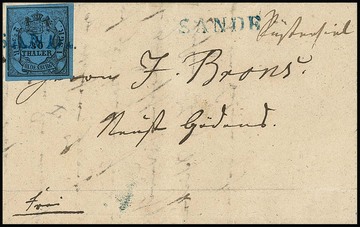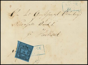 "Sande", Ra2 in blau auf zwei Briefen 1/30 Th. (Type I etwas ber., Type III tadellos vom linken Bogenrand), sowie auf Brief 1 Gr. und stark unfrischer Ganzsache 3 Gr.