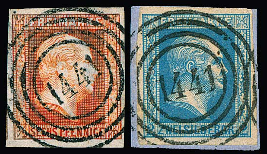 "1441" (Stollberg/Rheinland) je klar zentr. auf 1/2 Sgr. ziegelrot und Briefstück 2 Sgr. blau, beide Kabinett
