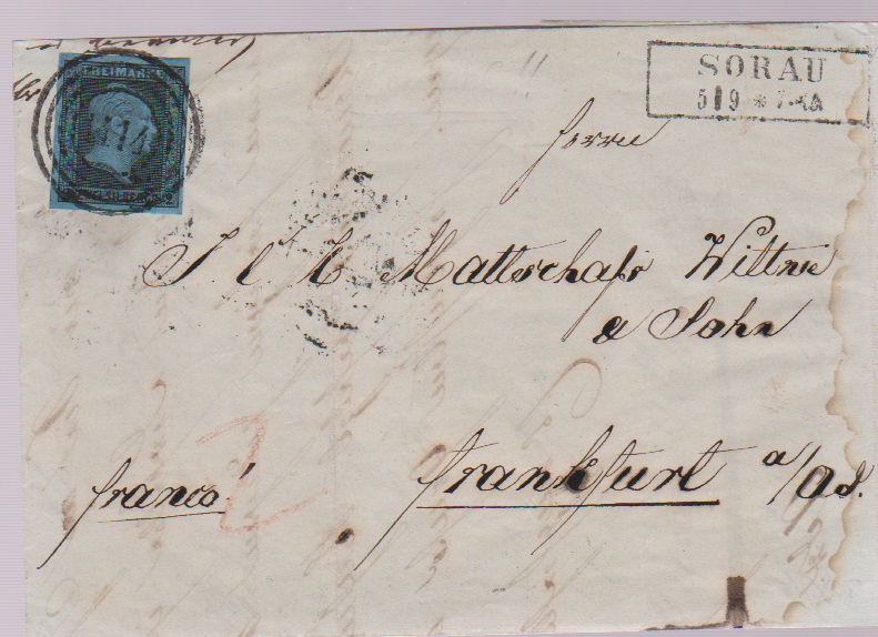 "1414" nebst Ra2 "Sorau" klar auf Brief (am Rand etwas wasserfleckig) mit breitrandigem Kabinettstück 2 Sgr.