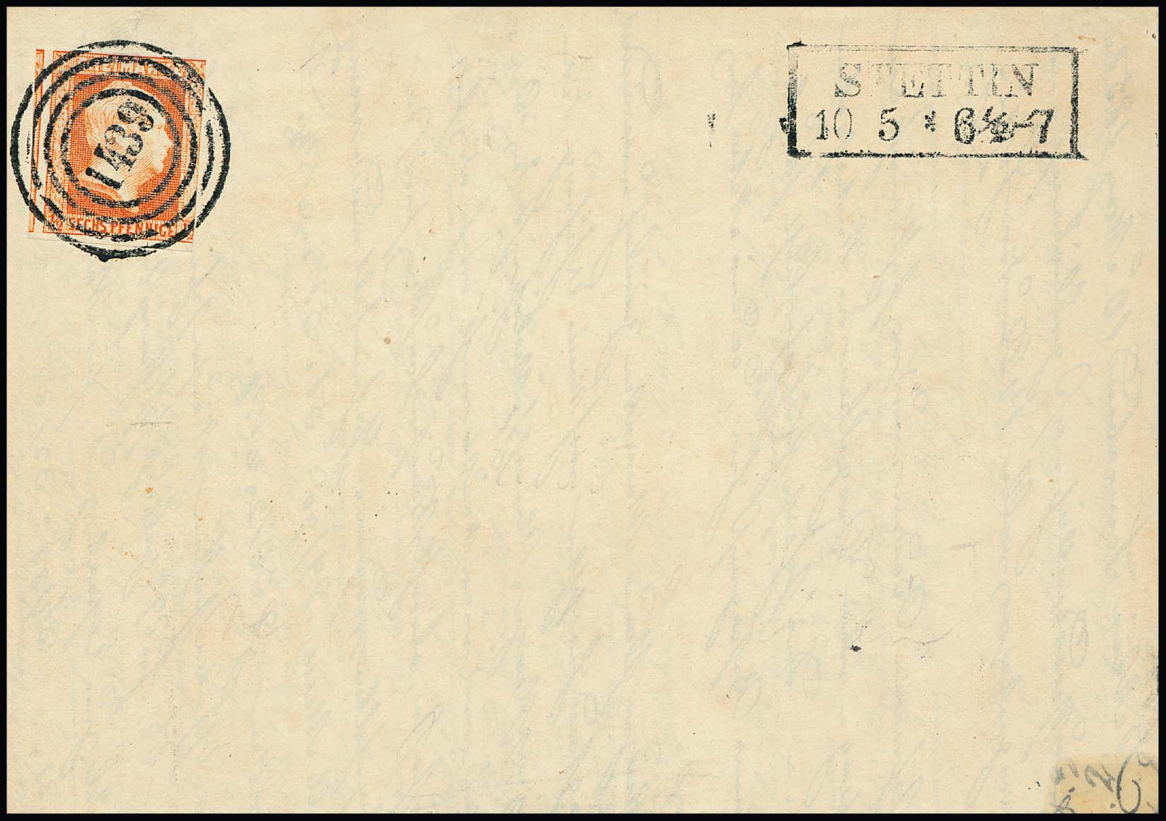 "1439" nebst Ra2 "Stettin" klar auf Drucksache (ohne Schleife) mit Einzelfrankatur 1/2 Sgr., rechts berührt und Drucksache kl. Klebestelle rechts unten. Mi. 600,-