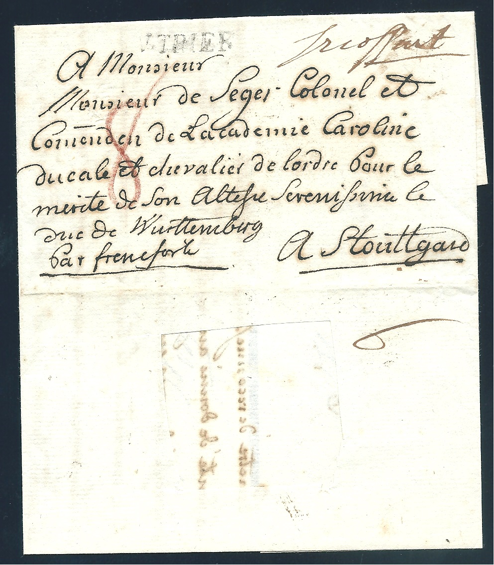 "Trier", 1791, besserer gebogener L1 "V. TRIER" (Feuser 3606-5/200,-) auf Brief mit Inhalt nach Stuttgart