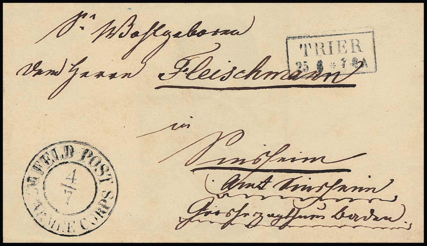 "Trier", (1850), Ra2 nebst K2 "FELD-POST (3.) ARMEE-CORPS" auf kleiner Briefhülle nach Sinzheim