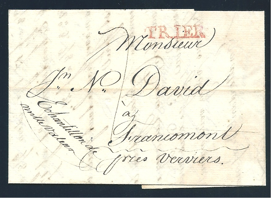 "Trier", 1816, orangeroter L1 auf kleinem Prachtbrief nach Francomont/Belgien