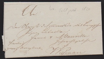 "Treis", 1814, Feldpostbrief mit kpl. Inhalt nach Weissenau bei Mainz (Belagerung von Mainz) an den Commandeur des bergischen Jäger-Bataillons, hs. vs. "Hierbei zwey Arrestanten"