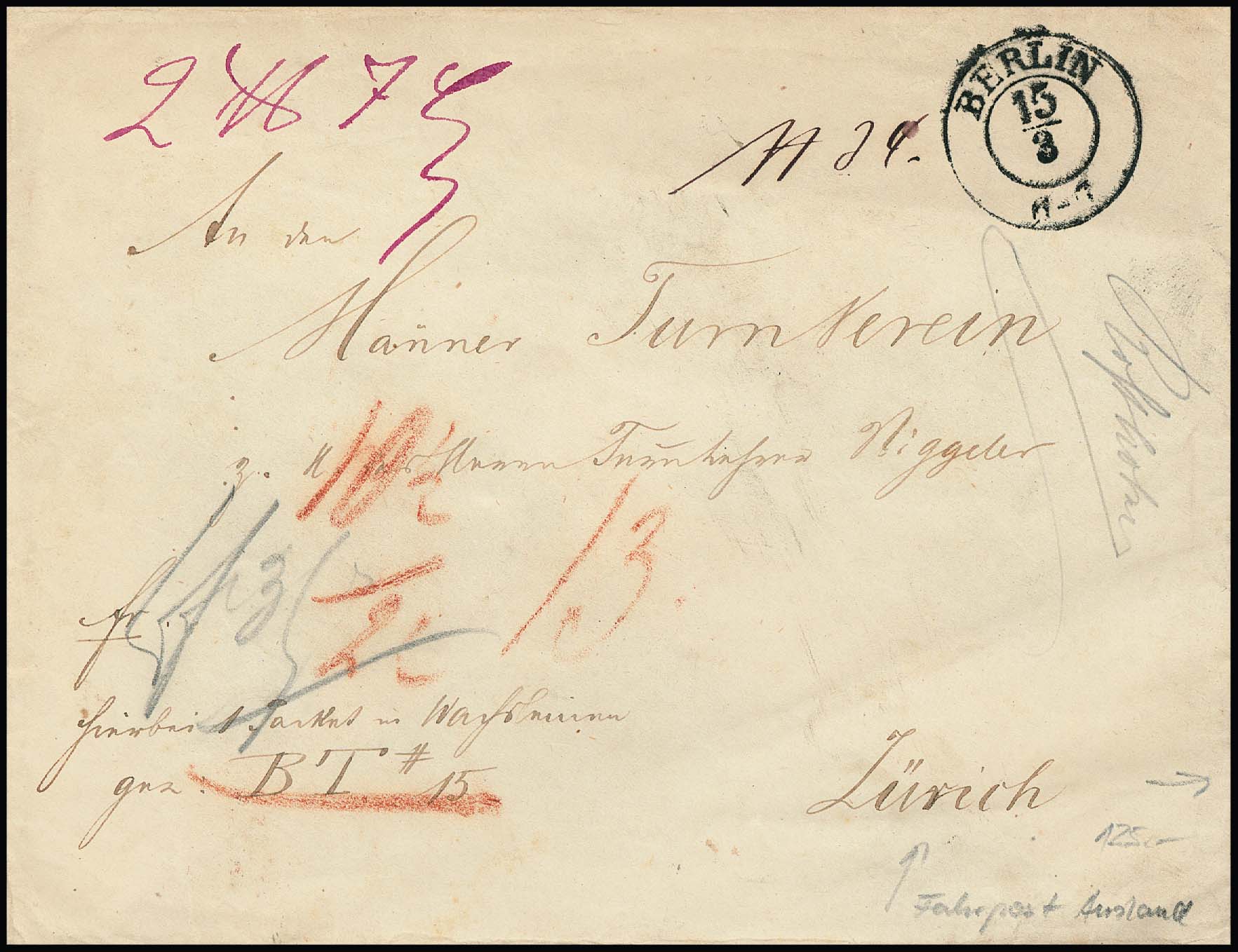 "Berlin", K2 (1851) auf Auslands-Paketbegleitbrief nach Zürich/Schweiz mit interessanten Taxen
