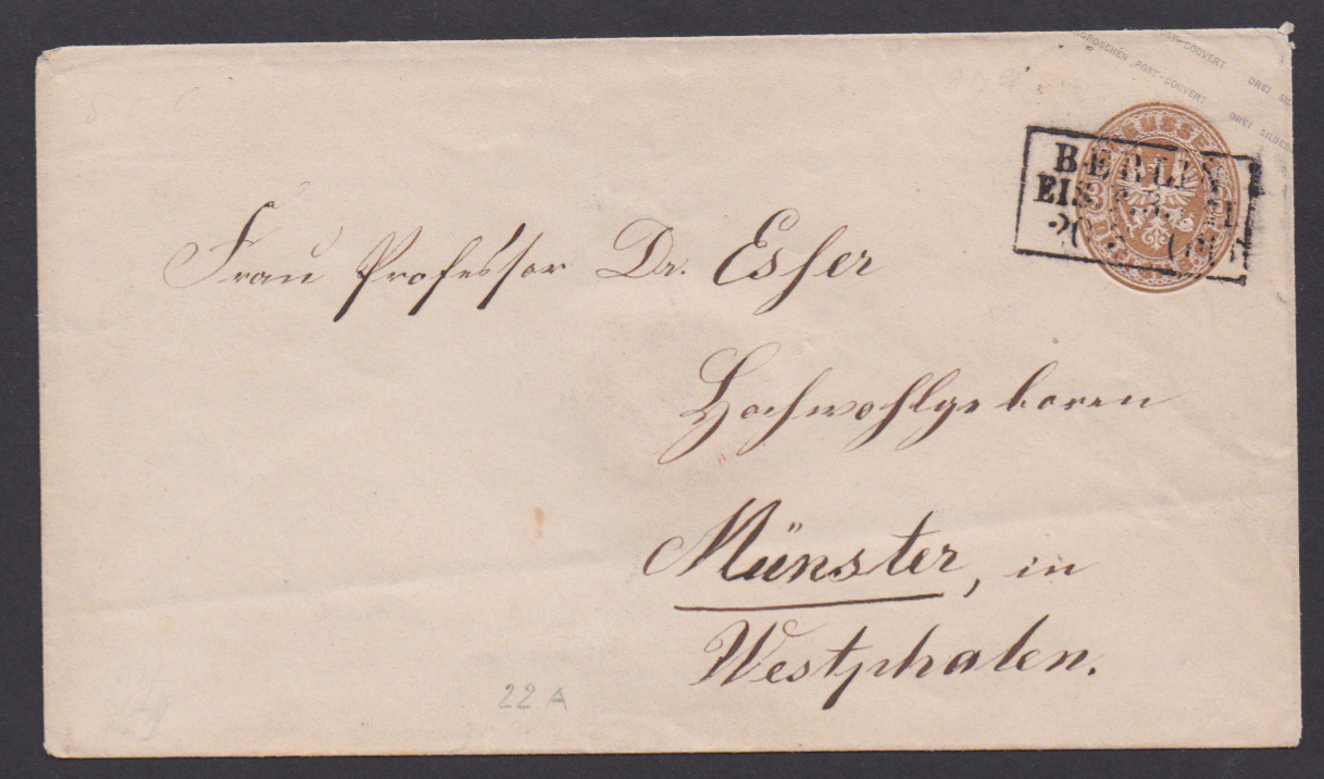 "Berlin Eis. P.B. No. I", besserer Bahnpost-Ra3 als alleinige Entwertung auf Wappen-Ganzsache 3 Sgr., sign. Banker