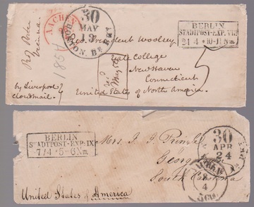 "Berlin Stadtpost-Exp. VIII", bzw. "Stadtpost-Exp. IX", je Ra3 auf zwei Übersee-Couverts (eines Mgl.) via Aachen (roter K1 bzw. schwarzer K2 "5 Cts.") je in die USA