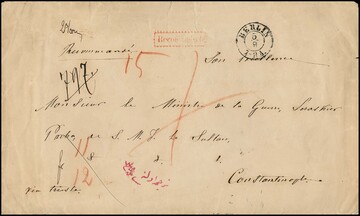 "Berlin", 1815, K2 auf Einschreibebrief der 3. Gewichtsstufe (entsprechend übliche Gebrauchsspuren) an den Kriegsminister des Paschas und Sultans in Constantinopel, Türkei, rs. Ankunfts-K1. Porto gemäß Rötel-Taxe 11 Sgr. Inland (dreimal 3 Sgr. + 2 Sgr. Reco) und 12 Sgr. Weiterfranko. Ex Schäfer