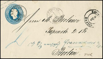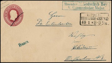 "Berlin Stadtpost-Exp. VIII", Ra3 nebst kleinem blauem L1 "Franco" auf Kopf-Ganzsache 1 Sgr. rosa nach Potsdam. Als Absenderstempel der blaue Ra2 "Absender: M. Nedschyb Bey K. Ottomanischer Major", ein türkischer Major während seines Aufenthaltes in Preussen zur militärischen Ausbildung und sicherlich einer der frühesten Belege zur deutsch-türkischen Militär-Zusammenarbeit