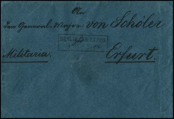 "Berlin Cab.-Exped.", (1855), seltener Ra2 auf blauem "Militaria"-Couvert aus dem Königshaus mit rs. Siegel nach Erfurt