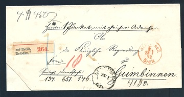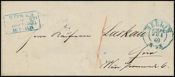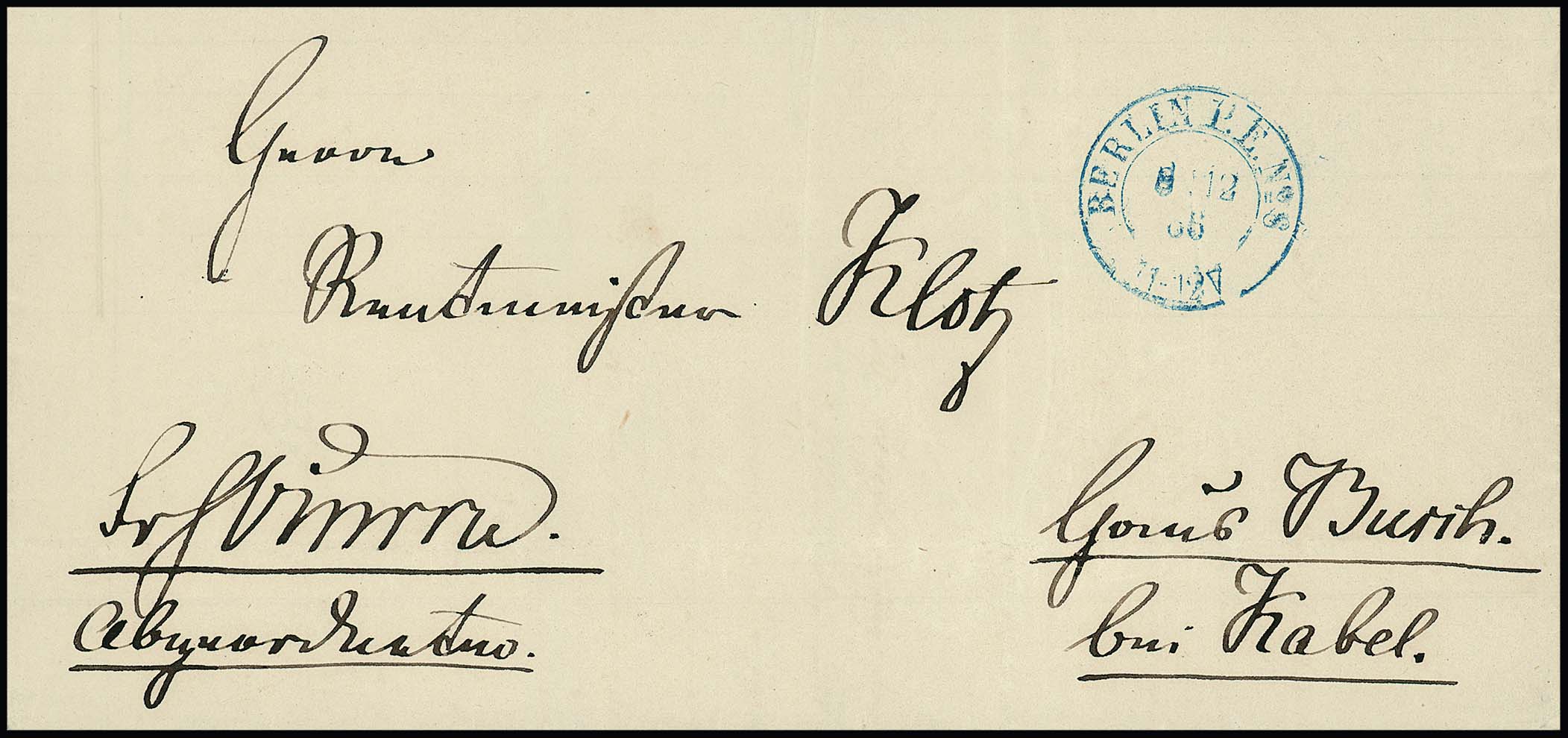 "Berlin H.ST.P.E.", blauer K2 von 27.1.69 auf unfrankiertem Ortsbrief (rs. seltener Maschinenstempel), ungewöhnlich, da sonst entweder eine Freimarke oder ein Franko-Stempel zur Anwendung kam. Dazu Ortsbrief 1871 mit Ra1 "Franco Stadtbrf."