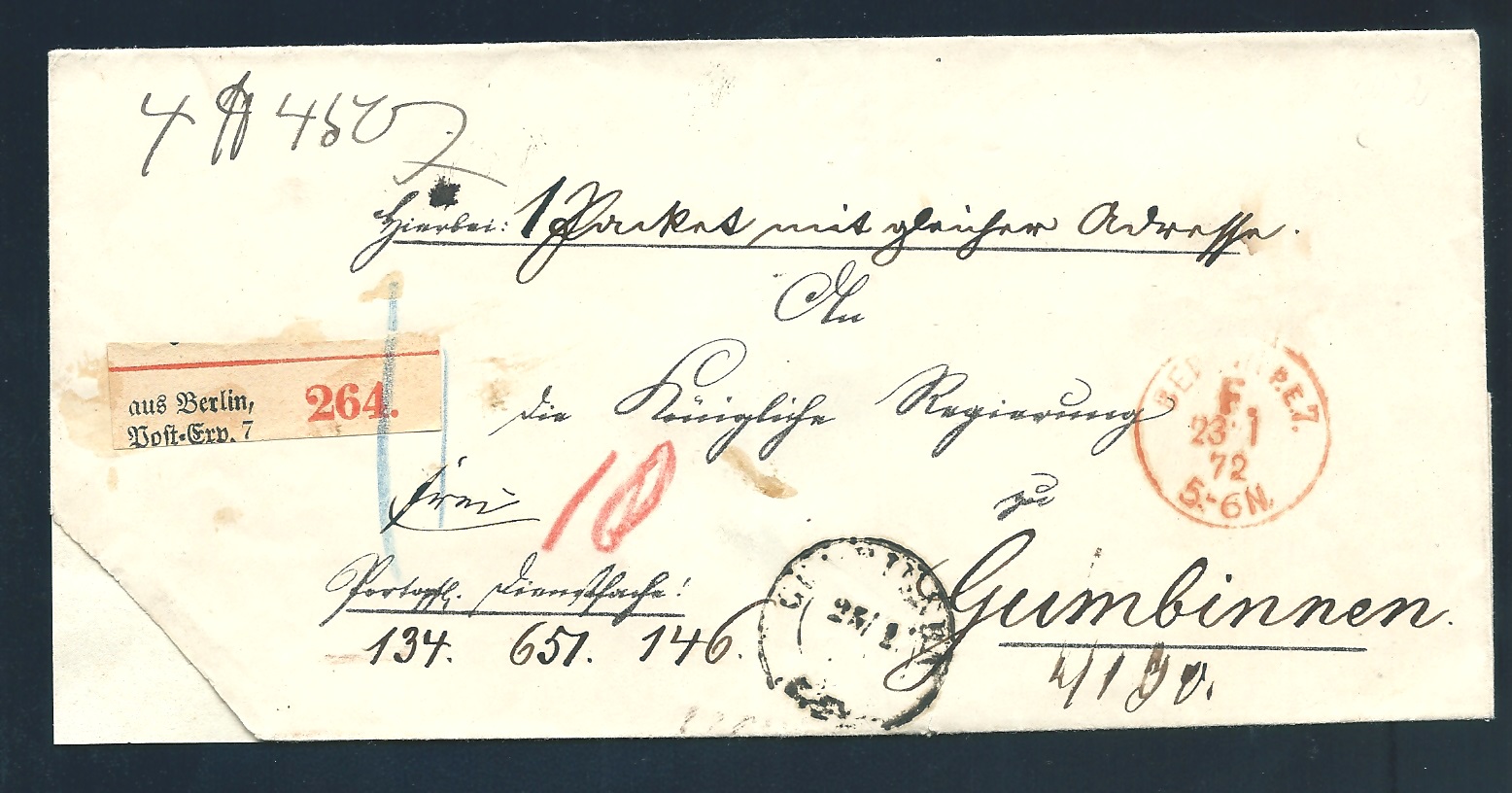 "Berlin P.E.7 F.", roter Franko-K1 klar auf Paketbegleitbrief 1872, kl. Aktenschnitt