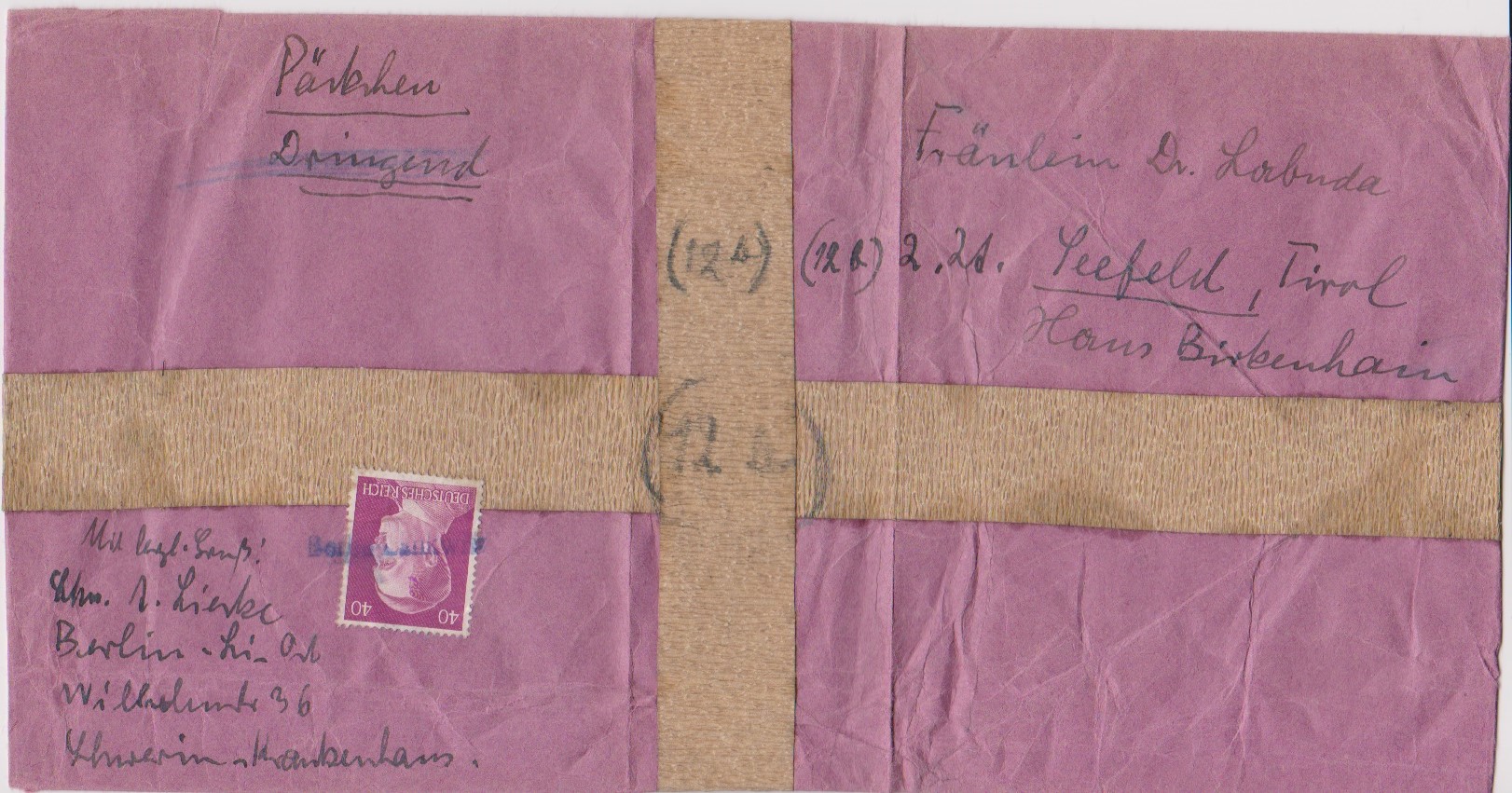 "Berlin-Lankwitz", seltener blauer Not-L1 auf Päckchen-Adresse mit 40 Pfg. Hitler (1943) nach Tirol