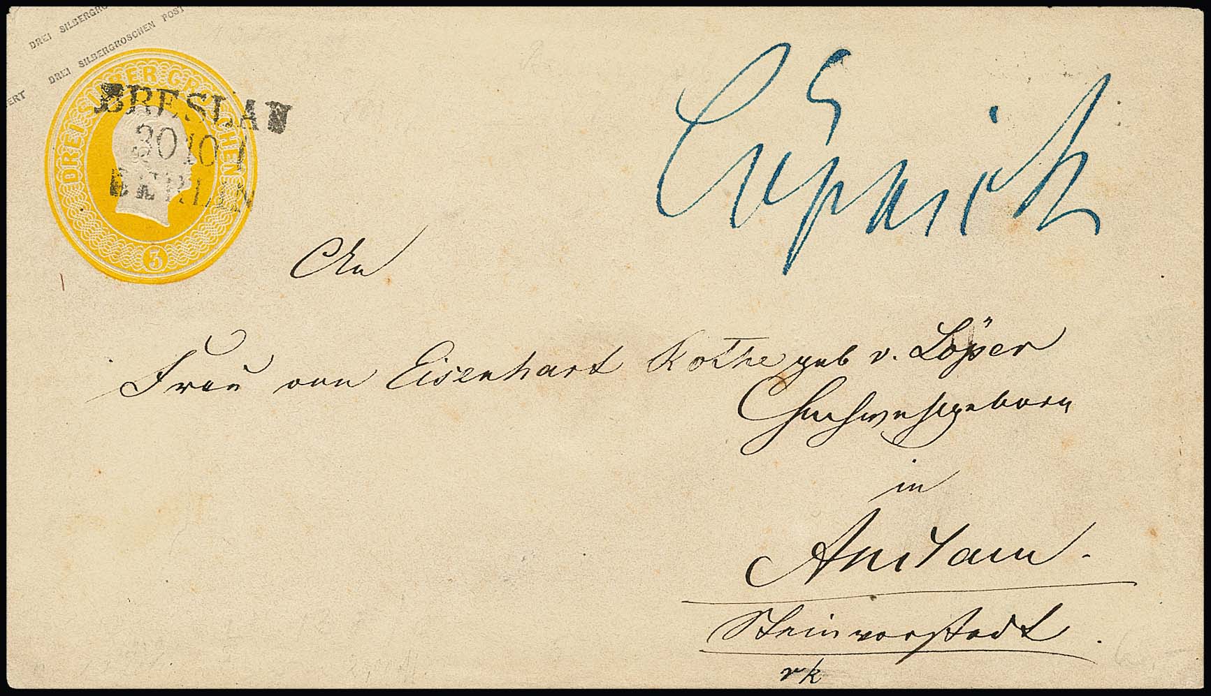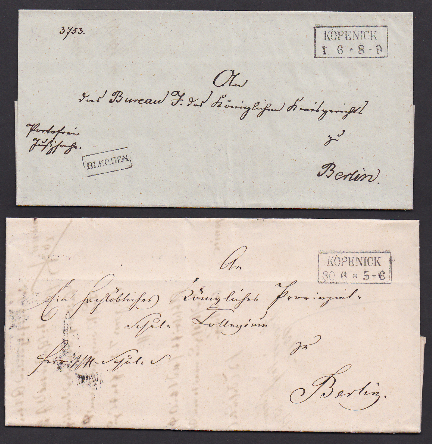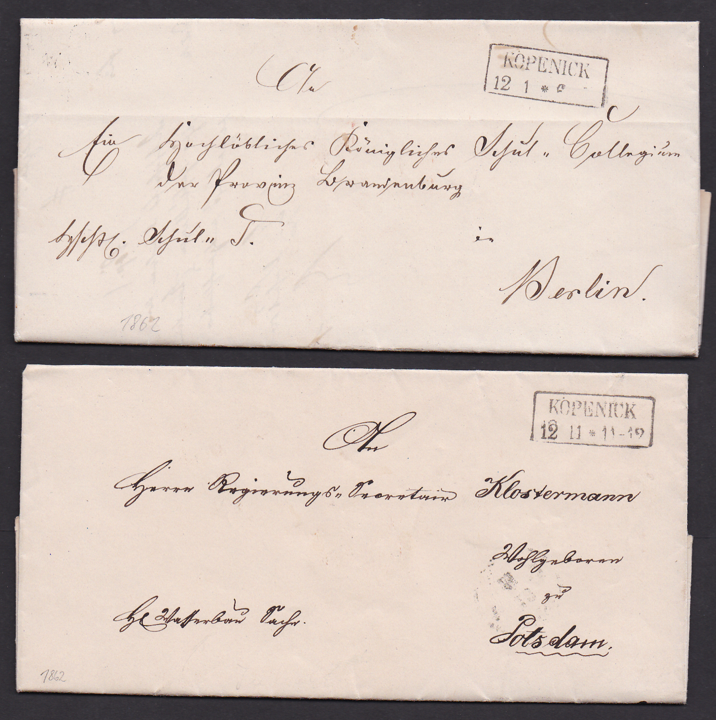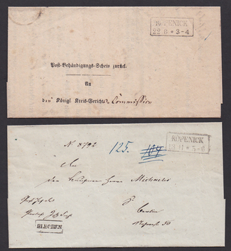"Cöpenick", einmal hs. Bahnpost-Aufgabe nebst Zug-L3 "Breslau-Berlin" auf Kopf-Ganzsache 3 Sgr., sowie Ra2 in leicht untersch. Typen auf zwei Ganzsachen 1 u. 3 Sgr.