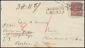 "Berlin Post-Exped. 13", K1 auf sog. "Treichel-Ganzsache", Aufbrauchscouvert NDP 1 Gr. auf Preußen 1 Sgr. im Großformat (leichte Mittefalte) nach Margonin, von dort weiteres "Treichel"-Couvert retour, Ra2 "Margonin" auf Kreuzer-Aufbrauchs-Couvert 3 Kr. a. Preußen 6 Kr. als Paketbegleitbrief (etwas fehlerhaft). Sehr seltenes "Treichel"-Paar, insbesondere mit Verwendung eines Kreuzer-Couverts in der preuß. Provinz