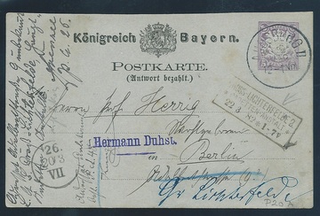 "Gross-Lichterfelde 2 Cadetten-Anstalt", Ra3 1882 auf Bayer. Ganzsachenkarte 5 Pfg. von Augsburg nach Berlin mit Weitersendung