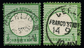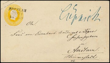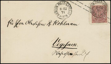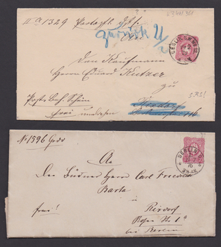 "Berlin Post-Exped. 13", K1 vom 8.12.1871 auf währungsfremd verwendeter NDP-Aufbrauchs-Ganzsache 3 Kr. rosa auf 1 Kr. grün, von Treichel nach Vegesack adressiert, dazu zweite, ebenfalls währungsfremd verwendete "Treichel"-Ganzsache, NDP 3 Kr.-Aufbrauchs-C-ouvert auf 6 Kr. mit K2 "Wongrowitz", 2.12.71, jetzt an Treichel in Berlin. Seltenes Paar!