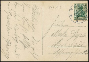 "Berlin C 2", sehr seltener Gummi-Versuchs-K1 vom 27.5.1913 (lt. Kartei Kruschel nur vom 27. bis 30.5.1913 belegt) klar auf Postkarte mit 5 Pfg. Germania. Aus der Slg. W. Kruschel