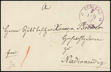 "Coblenz F.N.2", violetter Franko-K1 klar auf Brief vom 1.11.1867, zur Preußenzeit bisher unbekannt!