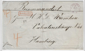 "Coblenz F.N.3", violetter Franko-K1 auf Doppel-Recobrief (Gebrauchsspuren) 1869, sowie auf Brief 1873, ferner in schwarz aptiert auf Auslandskarte 1878