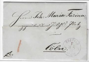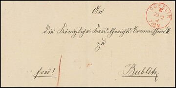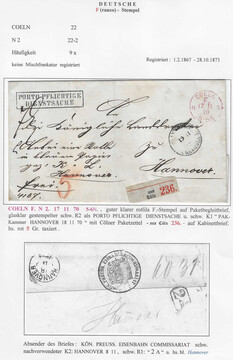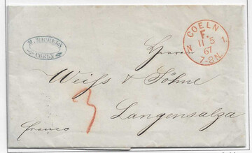 "Coeln F.N.1", roter Franko-K1 auf zwei Briefen 1867, ferner in violett auf drei Auslandsbriefen 1870, sowie roter K1 "Coeln Bahnhof F" 1867 auf Auslandsbrief (Gebrauchserhaltung)