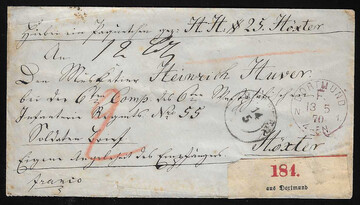 "Dortmund F.N.1", violetter Franko-K1 v. 13.5.1870 auf seltenem Soldaten-Paketbegleitbrief (typische Gebrauchsspuren) nach Höxter