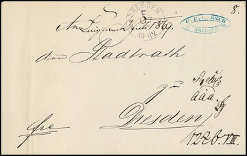 "Dresden F.N.2", violetter Franko-K1 1869 auf seltenem Ortscouvert (links Faltspur) ohne Portotaxe (Rate 1/4 Gr.)