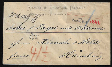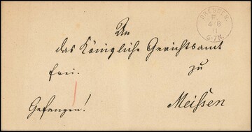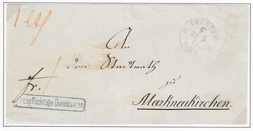 "Dresden F.N.1", violetter Franko-K1 in Verbindung mit schwarzem Taxstempel "1/4" auf Vordruck-Ortscouvert (dieses leichte Gebrauchsmgl.), lt. Hb. nur zwei derartige Briefe registriert