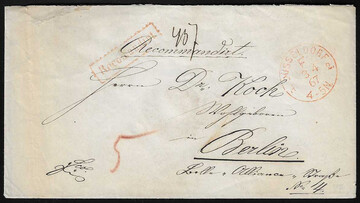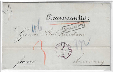 "Düsseldorf F.N.1", violetter Franko-K1 auf vier Briefen 1868-1872, dabei Auslandsbrief nach Limoges, sowie zwei Vordruck-Recobriefe aus gleicher Korrespondenz