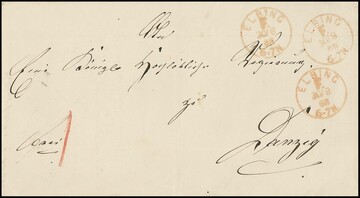 "Elbing F.", 1867-1872, roter Franko-K1 auf fünf Briefen, einmal 1868 kurios mit drei Abschlägen