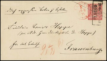 "Elbing F.", roter Franko-K1 auf Teilfranko-Ganzsache NDP 1 Gr. rosa, nebst schwarzem Ra2 "Elbing" als Expreßbrief, oben Öffnungsmgl., ferner der rote K1 1872 auf sehr dekor. Recobrief