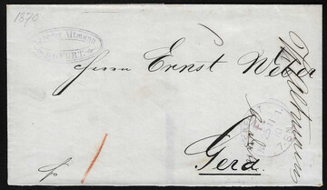 "Erfurt F.N.1", roter Franko-K1 auf drei Briefen 1867, einmal sehr ungewöhnlich ohne Taxe, ferner violetter K1 auf zwei Briefen 1870-72, sowie der "F.N.2" in violett auf Brief 1809