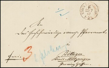 "Essen R.B. Düsseldf.", roter Franko-K1 in bisher frühest bekannter Verwendung auf Landbestellbrief vom 22.7.1867, dazu violetter K1 auf zwei Briefen 1869/70, einer mit Nachtaxe