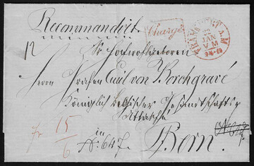 "Frankfurt a.M.", roter K1 als Vorläufer des Franko-Stempels auf Auslands-Chargébrief 1867 nach Bern/Schweiz, Taxe "15/6"