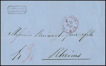 "Frankfurt a. Main F.N.1", violetter Franko-K1 auf zwei Auslandsbriefen 1870 aus gleicher Korrespondenz nach Rheims/Frankreich. Am 7.4. Auslandsporto "12x" austaxiert, am 16.12. jedoch nur "3x" aufgrund der Deutschen Besetzung im Deutsch-Französ. Krieg, mit diesem Porto nur wenige Briefe bekannt!