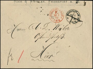"Frankfurt a. Main F.N.1", roter Franko-K1 auf ungewöhnlichem Vordruck-Ortsbrief 1873 (Taxe "1"), erst der aptierte K1 "N.3" in schwarz abgeschlagen, dieser gestrichen und der rote K1 nebengesetzt