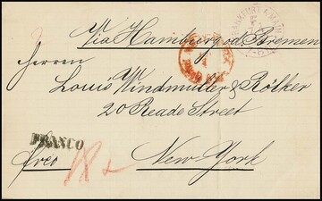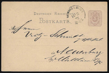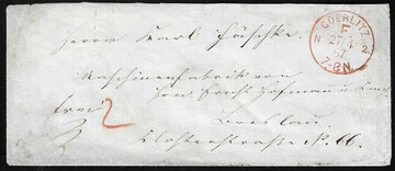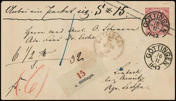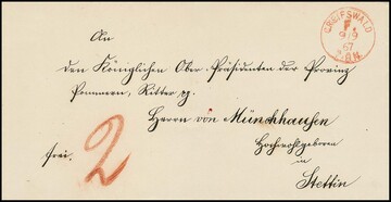 "Greifswald F.", roter Franko-K1 auf kalligraphisch besonders schönem Brief vom 9.9.1867 an von Münchhausen, sowie nebst schwarzem K2 1869 auf seltener Teilfranko-NDP-Aufbrauchs-Ganzsache 1 Gr. a. Preußen 3 Sgr., erst mit Nachtaxe nach Zürich, diese aufgrund der erkannten Teilbarzahlung wieder gestrichen und weiter nach Heidelberg (Taxe "12" Kr.), kl. Mgl.
