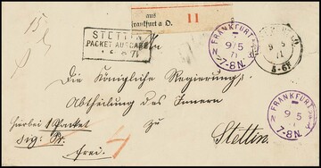 "Frankfurt a.O. F.N.3", violetter Franko-K1 vom 9.5.71 zweifach, nebst schwarzem K2, auf Paketbrief nach Stettin