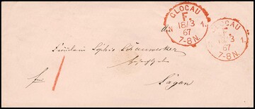 "Glogau F.N.1", roter Franko-K1 auf vier Briefen 1866/67, dabei frühest bekanntes Verwendungsdatum 20.12.66, sowie auf zwei Damenbriefen aus gleicher Korrespondenz, davon einer Reco (einziger bekannter Brief dieses Ortes). Dito der Franko-K1 aptiert auf zwei Brustschildkarten (F.N.1 und F.N.2)