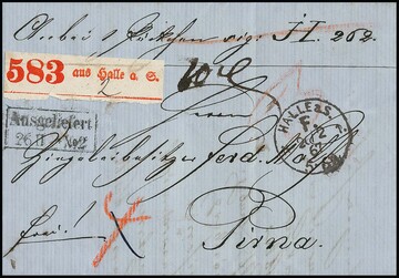 "Halle a.S. F.N.1", roter K1 vom 21.12.66 als bisher frühest registriertes Verwendungsdatum auf (rs. unkpl.) Brief, ferner auf Brief vom 1.7.67 (rs. blauer K2 "Halle"), sowie in praktisch schwarzer Farbe (selten!) auf Paketbrief vom 26.2.67
